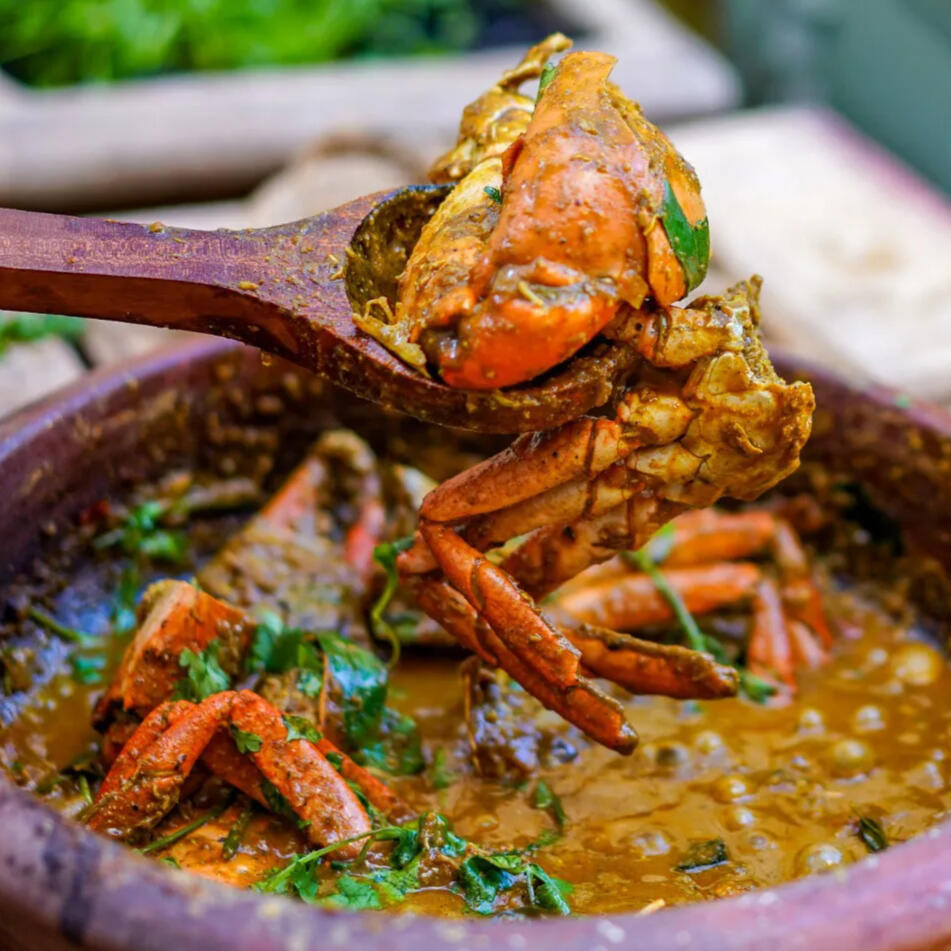 A popular dish in Southern Thavnair, particularly in Yedlihmad and Akyali. This spicy crab curry is made with blue crab, tamarind, red chilli powder, and a mixture of other Thavnairian spices. The crab is cooked shell on in the curry itself. The long simmering process imparts the flavor of the curry in every bit of crab meat you can extract. Tools are provided to help crack the crab open and bibs are also available on request.